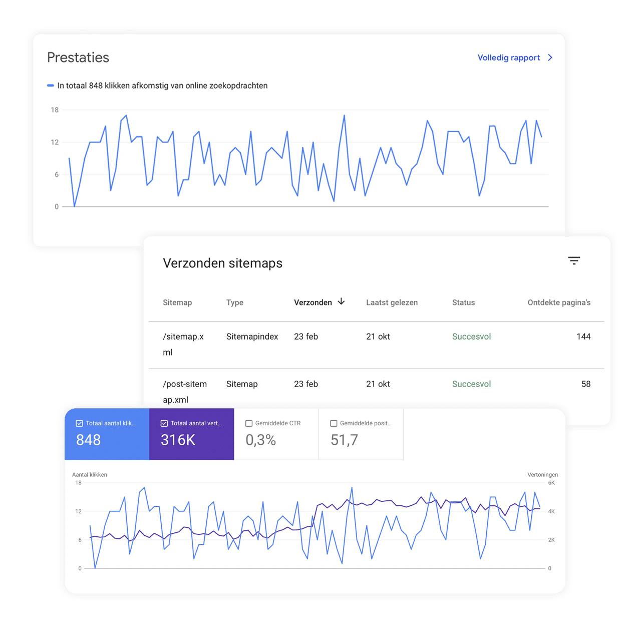 Met Google Search Console krijg je inzicht in hoe jouw automotive-website presteert in Google. Ontdek met welke zoekwoorden je wordt gevonden en welke pagina’s het meest bezocht worden. Een belangrijke stap is het aanmelden van de sitemap, zodat Google je site sneller en vollediger indexeert – ook pagina’s die niet in het menu staan.